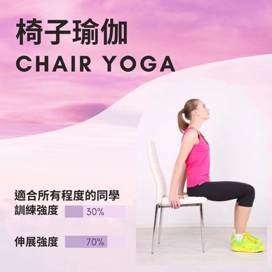 椅子瑜伽將瑜伽動作結合座椅輔助,針對肩頸、背部與腰部的僵硬與姿勢不良進行調整。課程同時訓練核心穩定性與關節活動度,讓久坐族群或初學者也能輕鬆改善體態及緩解肌肉緊繃。